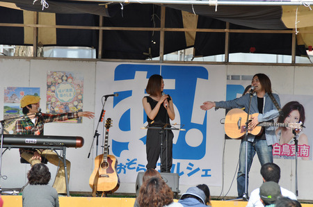左よりChoji、白鳥吏南、ave 。 「あおぞら!マルシェ」の締め括りに「ただいま」を披露。