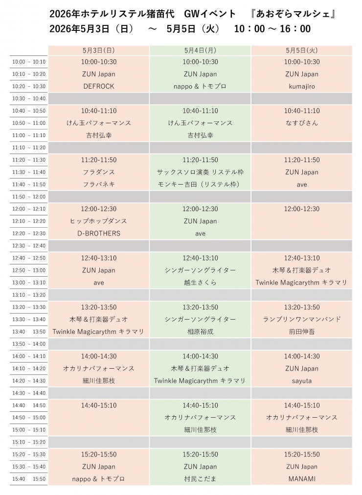2026 GWイベント「あおぞらマルシェ」ステージ出演者一覧&タイムテーブル