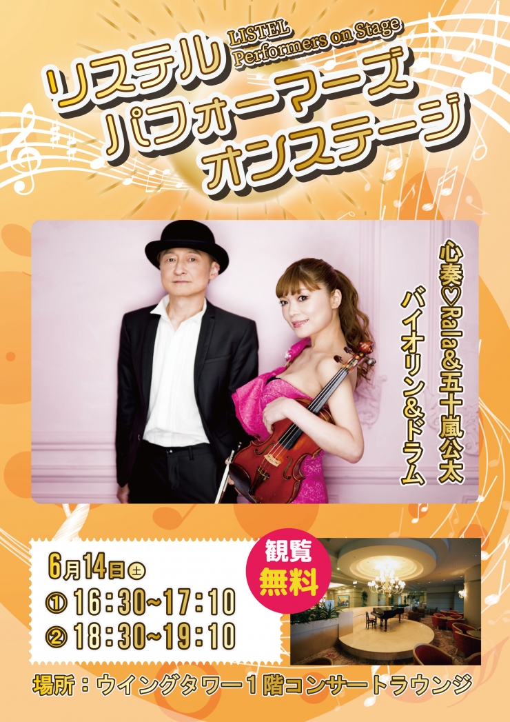 『リステル パフォーマーズオンステージ』 6月14日(土)バイオリン&ドラム 音楽でニッポンを元気にしようぜ