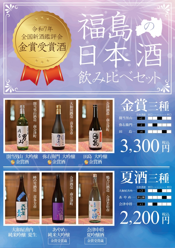 3年ぶりに全国新酒鑑評会で金賞受賞酒数ナンバ-1に返り咲いた福島県は現在にわかに日本酒で盛り上がっています。その金賞を受賞した銘柄を3種、さらに夏限定銘柄を3種、それぞれ飲み比べセットにしました。