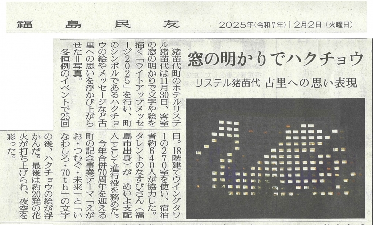 2025年11月30日に行われた年末恒例のお客様感謝イベント、ライトアップメッセージにて参加者の皆さんが協力して作り上げた数々のメッセージ、福島民友紙の記事です。