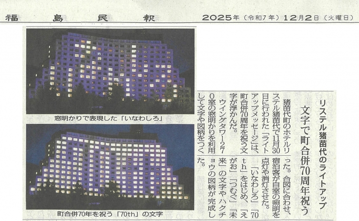『リステル猪苗代のライトアップ 文字で町合併70周年祝う』 2025年12月2日 福島民報