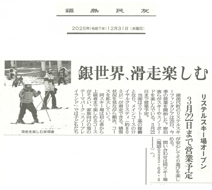 リステルスキー場オープン 2025年12月31日 福島民友