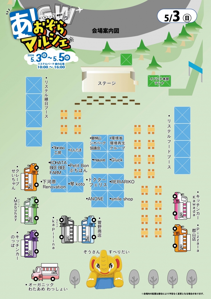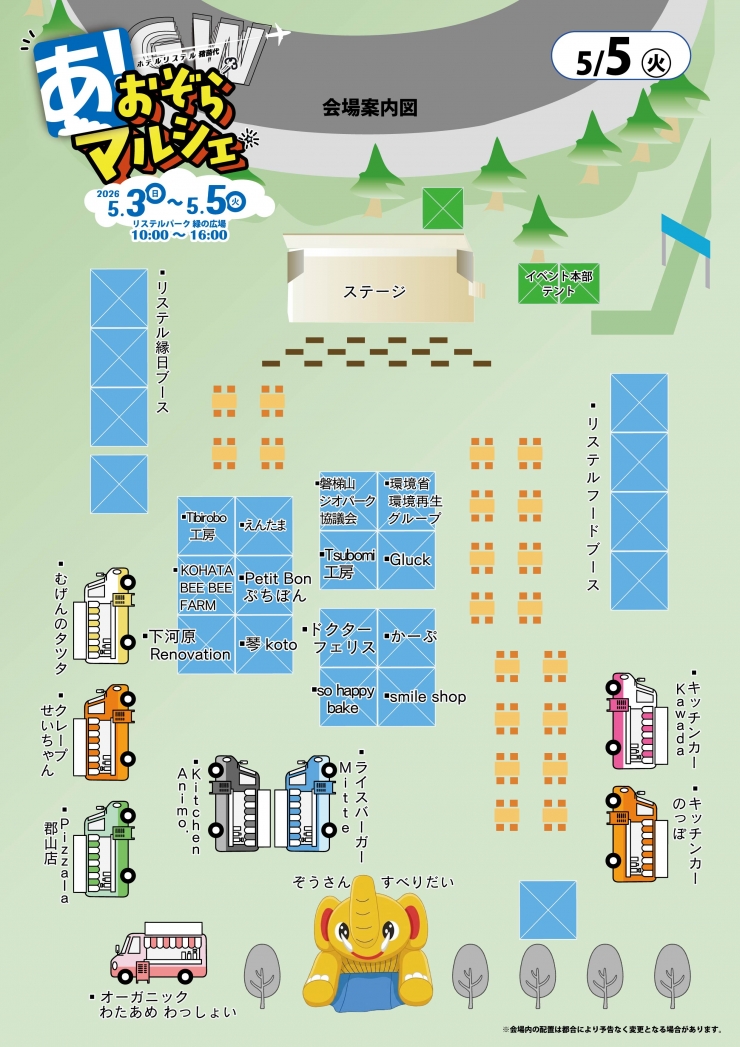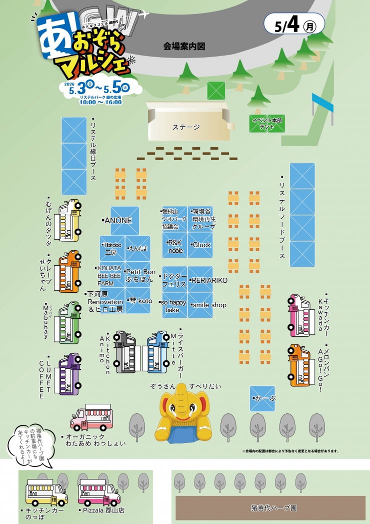 ・クレープせいちゃん-上限に達しました ・キッチンカーKawada ・smile shop(テント出店) ・オーガニックわたあめわっしょい ・むげんのタツタ ・めろんぱん A Go! Go! ・ライスバーガーMitte ・Kitchen Animo. ・LUMETO COFFEE ・Mabuhay 猪苗代ハーブ園前出店 -上限に達しました ・PIZZALA郡山店 ・キッチンカーのっぽ |