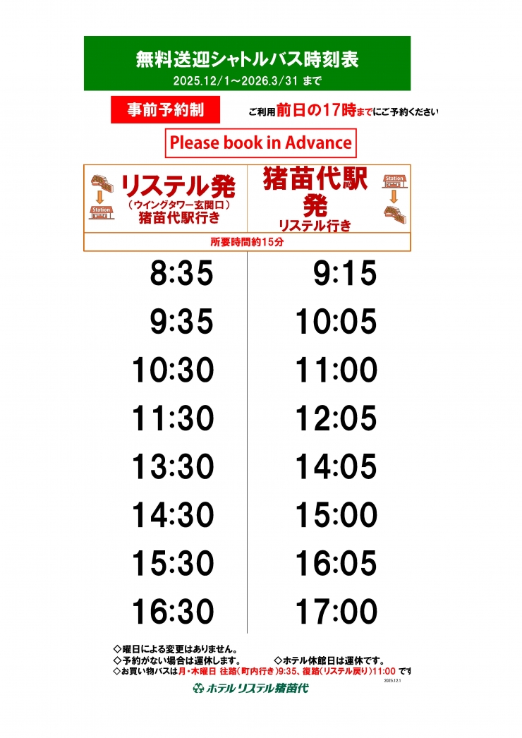 【事前予約制】猪苗代駅~ホテル 無料シャトルバスのご案内