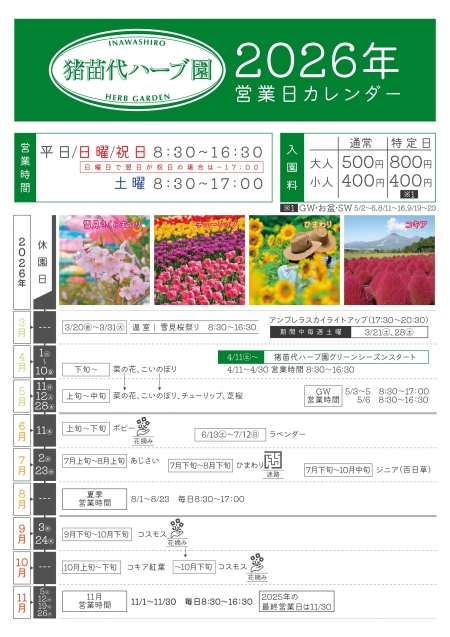 2026年の猪苗代ハーブ園は4月11日(土)オープンです。