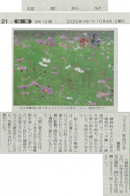 『コスモス秋告げる猪苗代』 2025年10月4日 読売新聞福島版