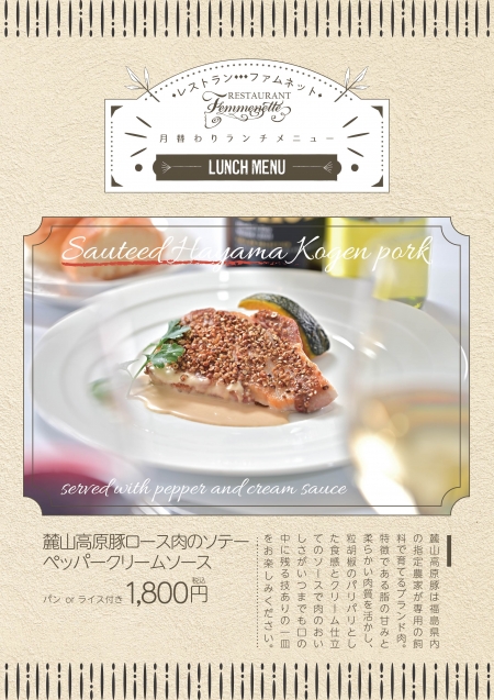 レストランファムネット 月替わりランチメニュー『麓山高原豚ロース肉のソテーペッパークリームソース』