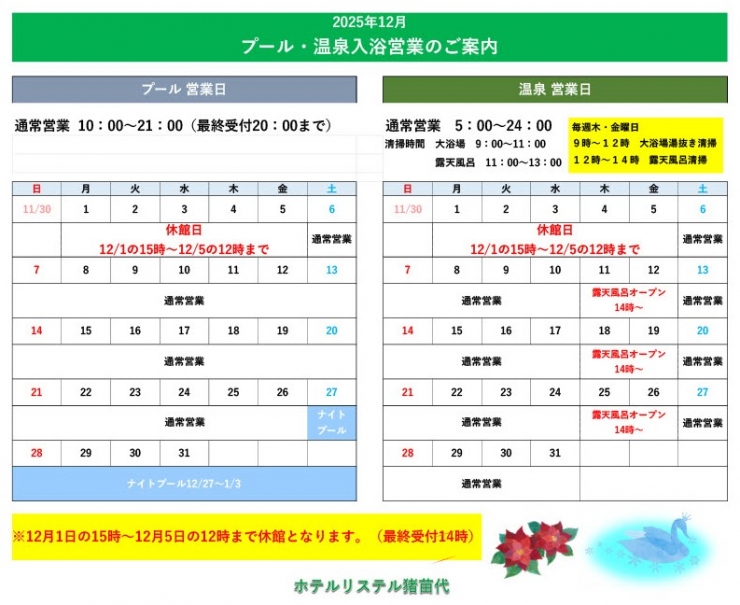 ホテルリステル猪苗代の温泉、屋内&屋外プールは日帰り利用が可能です。