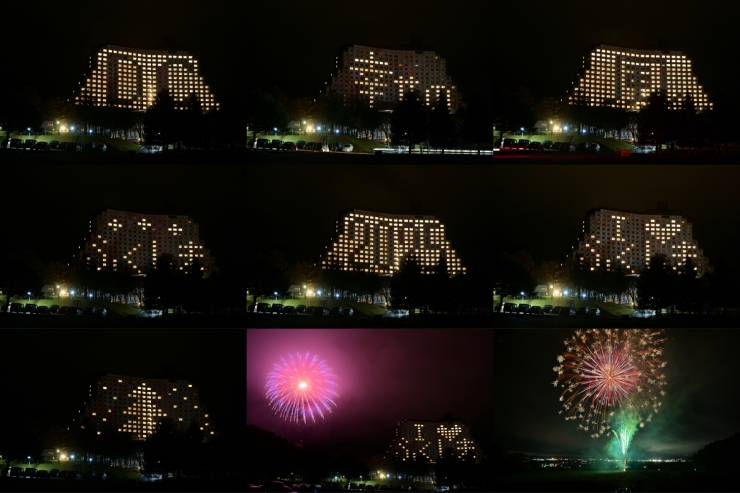 当日宿泊されたお客さま全員が協力してホテルの窓の明かりでモザイクアートのように絵や文字を浮かび上がらせるイベントです。