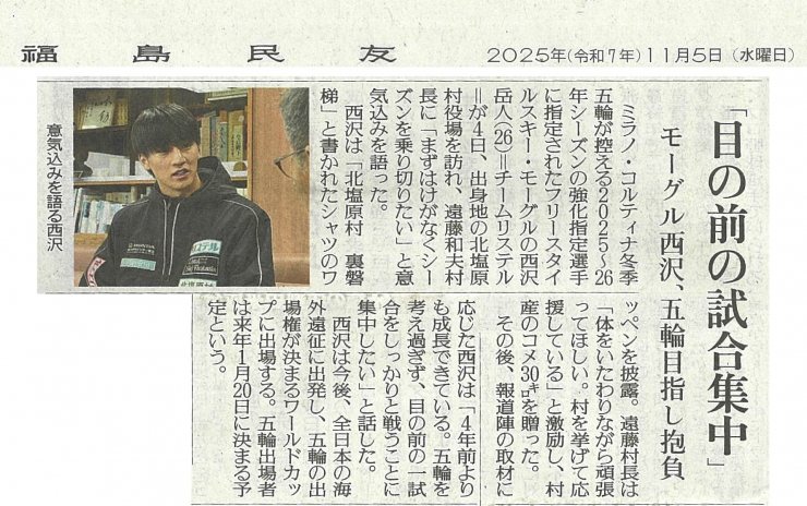 『目の前の試合集中 モーグル西沢、五輪目指し抱負』 2025年11月5日 福島民友