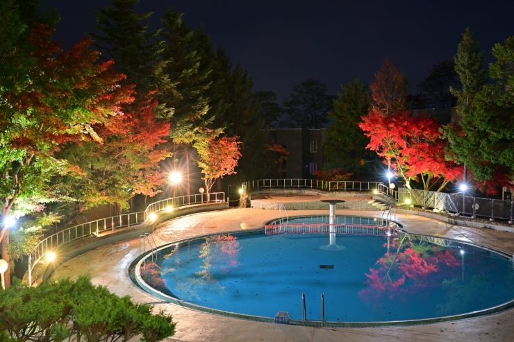 ホテルリステル猪苗代も敷地内で見事に色づく木々があちらこちらに見られますが、夏にたいへんな賑わいをみせたガーデンプールの周囲のもみじをライトアップで輝かせています。