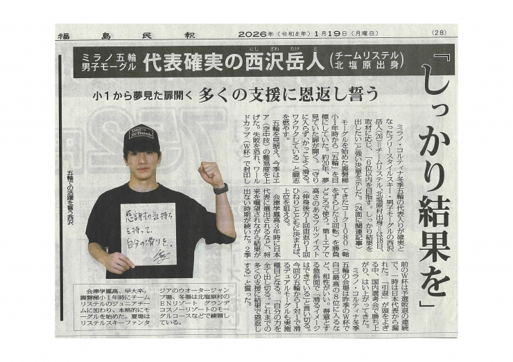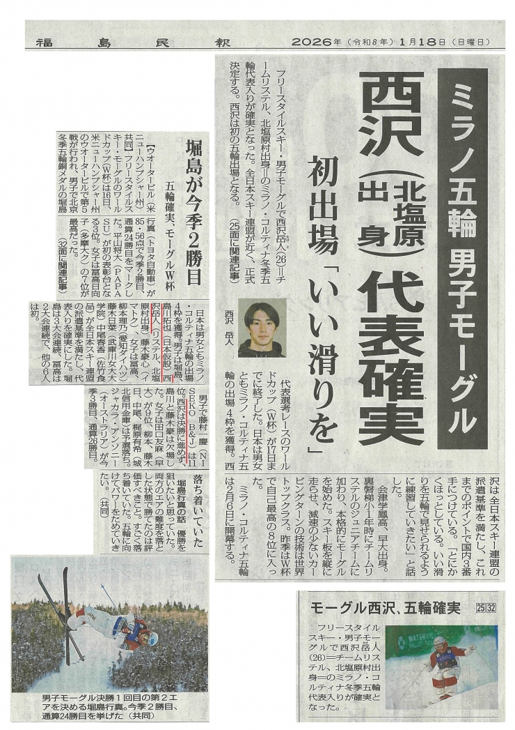 ミラノ五輪男子モーグル 西沢(北塩原出身)代表確定 2026年1月18日 福島民報