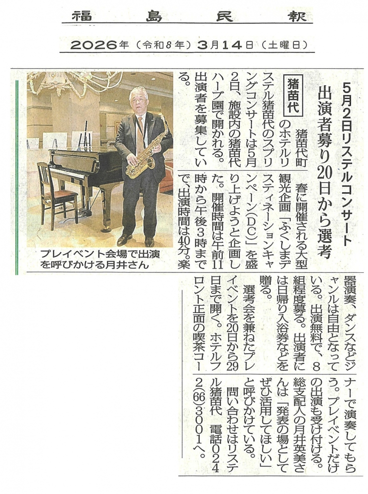 2026年5月2日(土)猪苗代のホテルリステル猪苗代にて開催される「リステルコンサート」