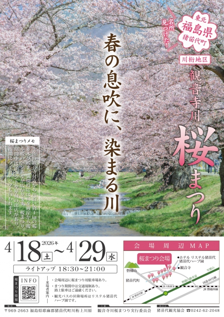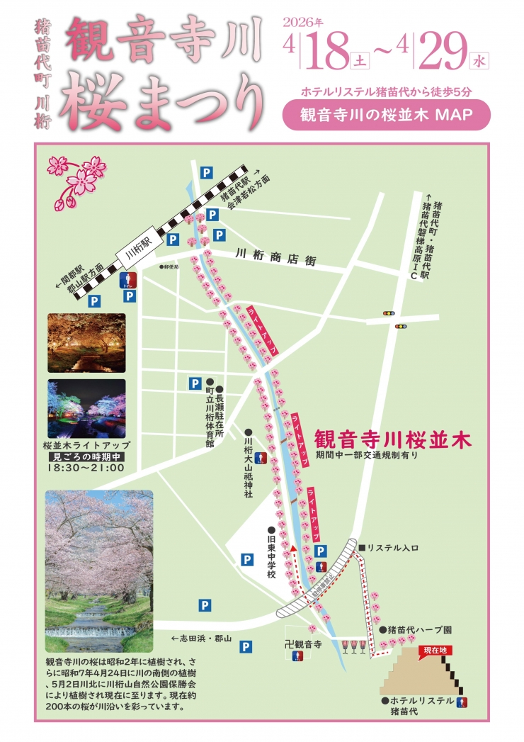 ホテルリステル猪苗代から歩いて10分程度の場所にある、観音寺川の桜並木が4月11日開花しました。