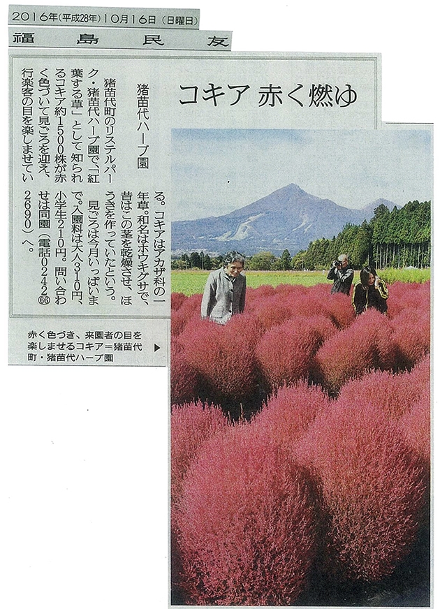 猪苗代ハーブ園で今年から栽培を始めたコキアが、福島民友に掲載されました。