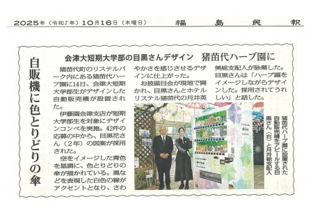 『会津大短期大学部学生デザインの自販機が猪苗代ハーブ園に設置』2025年10月16日福島民報