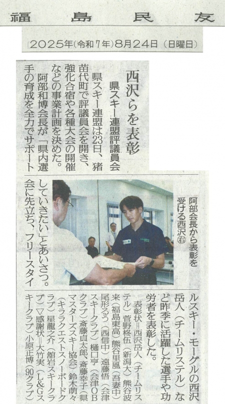 『成績優秀の西沢ら表彰 県スキー連盟』2025年8月24日 福島民報