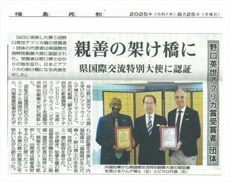 野口英世アフリカ賞受賞者認証式 2025年8月25日 福島民報・福島民友