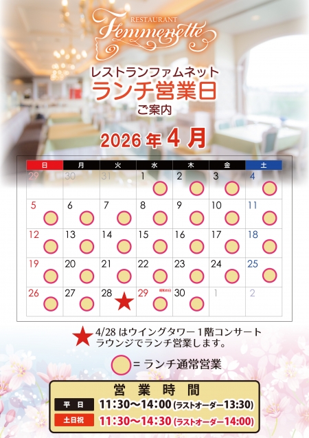 【ランチ営業日のお知らせ】ホテルレストラン ファムネット