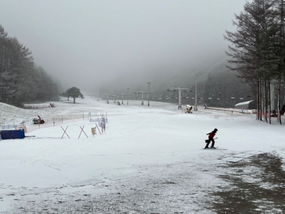 1月10日 気温0℃、昨日はお天気よくてコースが途切れかかっていましたが、昨夜は少し雪が降ってくれて今朝のゲレンデは真っ白です。途切れかかった個所に雪出しをして営業を開始します。今晩から冷え込みそうなので人工降雪機がフル稼働できそうです。