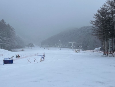 1月7日 氷点下の朝、-1.3℃。雪が舞っているゲレンデは久しぶり。いっぱい積もってくれそうなほどの雪ではありませんが、昨日までギリギリで小川のようにつないできたゲレンデも今日はお日様と競争しなくてよさそうです。ただ、うっすらと白くなっている下がすぐ地面となっていますので、滑走される際は良くコース状況を観察してスピードは控えめにしていただくようご協力ください。皆様のご協力のおかげで大きな事故なく今日まで営業ができています。誠にありがとうございます。