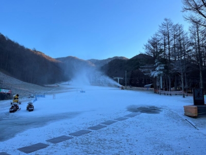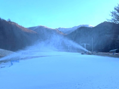 1月2日 8時現在‐3℃、数日ぶりの冷え込みで人工降雪機が稼働中。今日は冷え込み続く限りギリギリまで稼働します。まだコースが途切れそうなところはいくつかありますが、人力で雪を運んで維持してきたゲレンデも少しだけ回復しました。昨日は強風で厳しいお天気でしたが、今日は風も穏やかでお天気よくプラスの気温を維持しそうです。