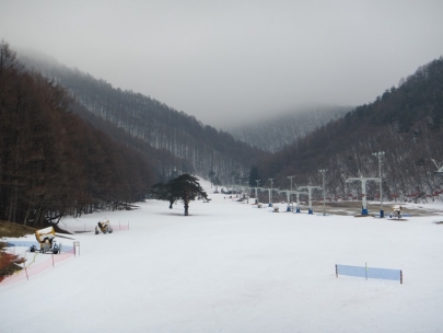 今朝のゲレンデ上空は曇り空。湖の方は青空が見えてます。